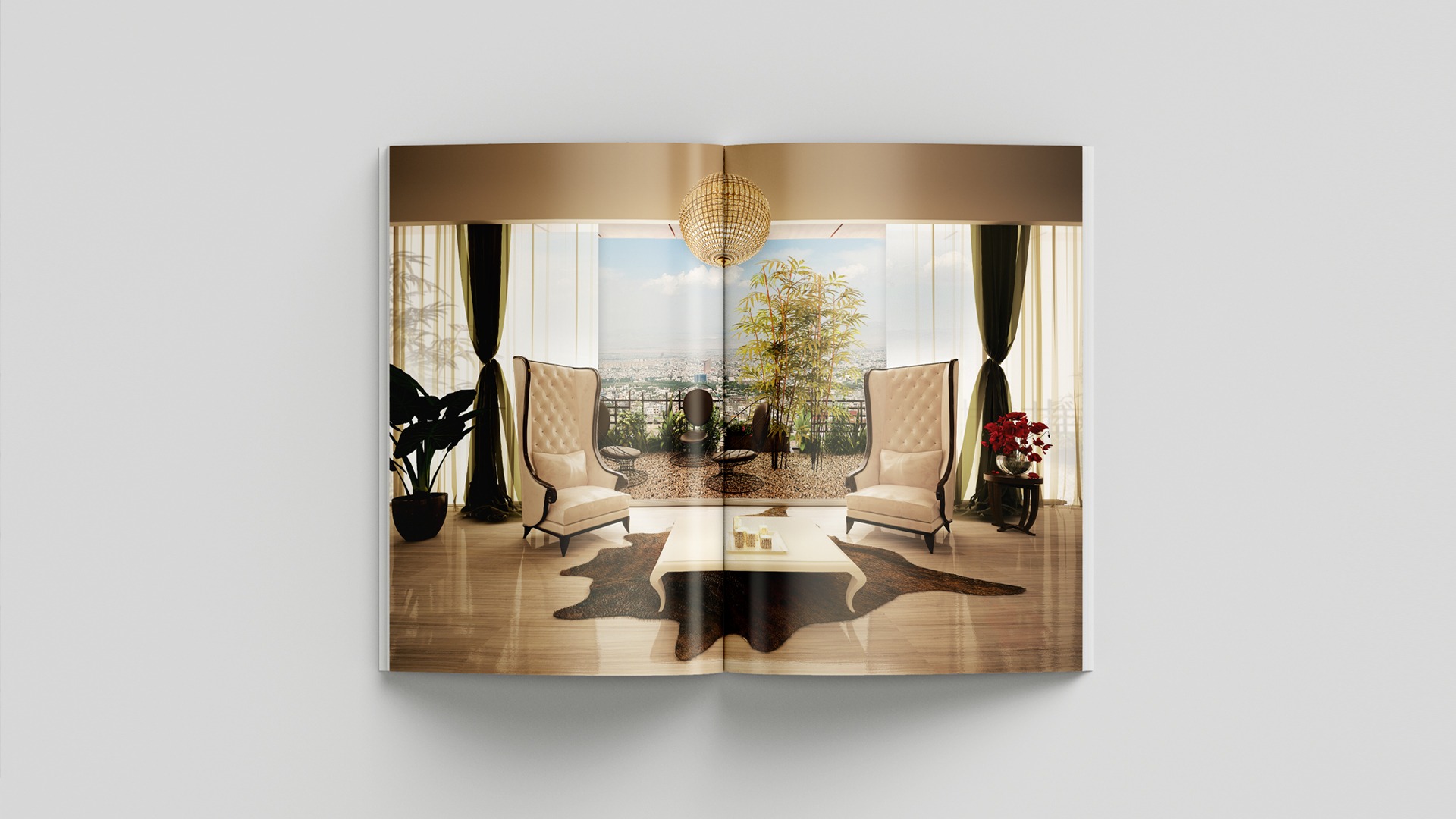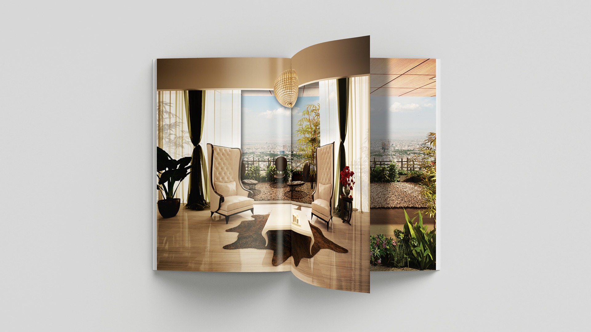 To display this feature, two opposite panels were designed to show the view of the living room. There is also a beautiful view of the living space and open windows that connect the house to the outside courtyard.