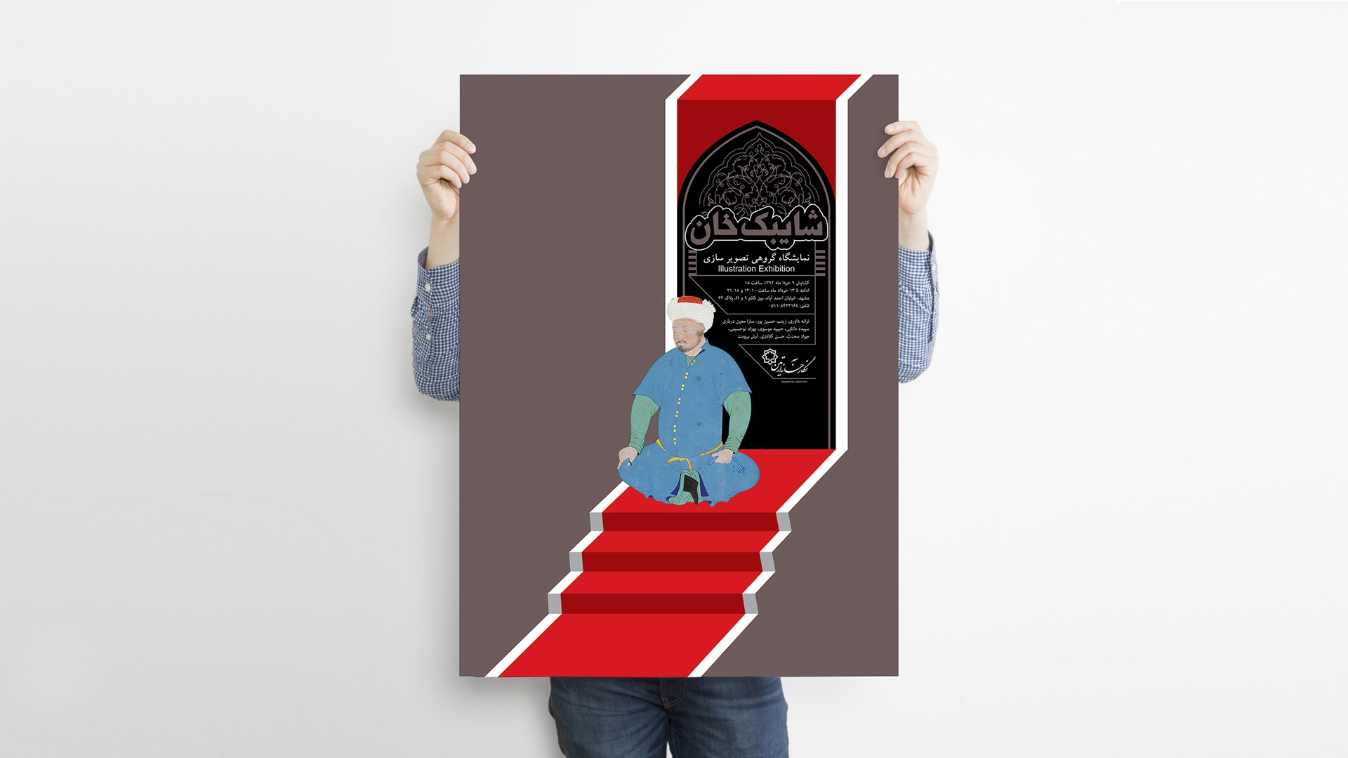 This poster was designed to inform about an illustration exhibition. The title of the exhibition was named after Shaybak Khan, who was one of the founders of the Uzbek dynasty. Therefore, we decided to use the main character in the poster design, which is extracted from a painting by Kamaluddin Behzad.